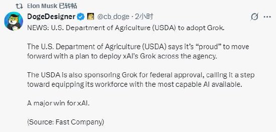 马斯克在X平台上转发其粉丝分享的消息称,美国农业部 (USDA) 将采用Grok人工智能系统。